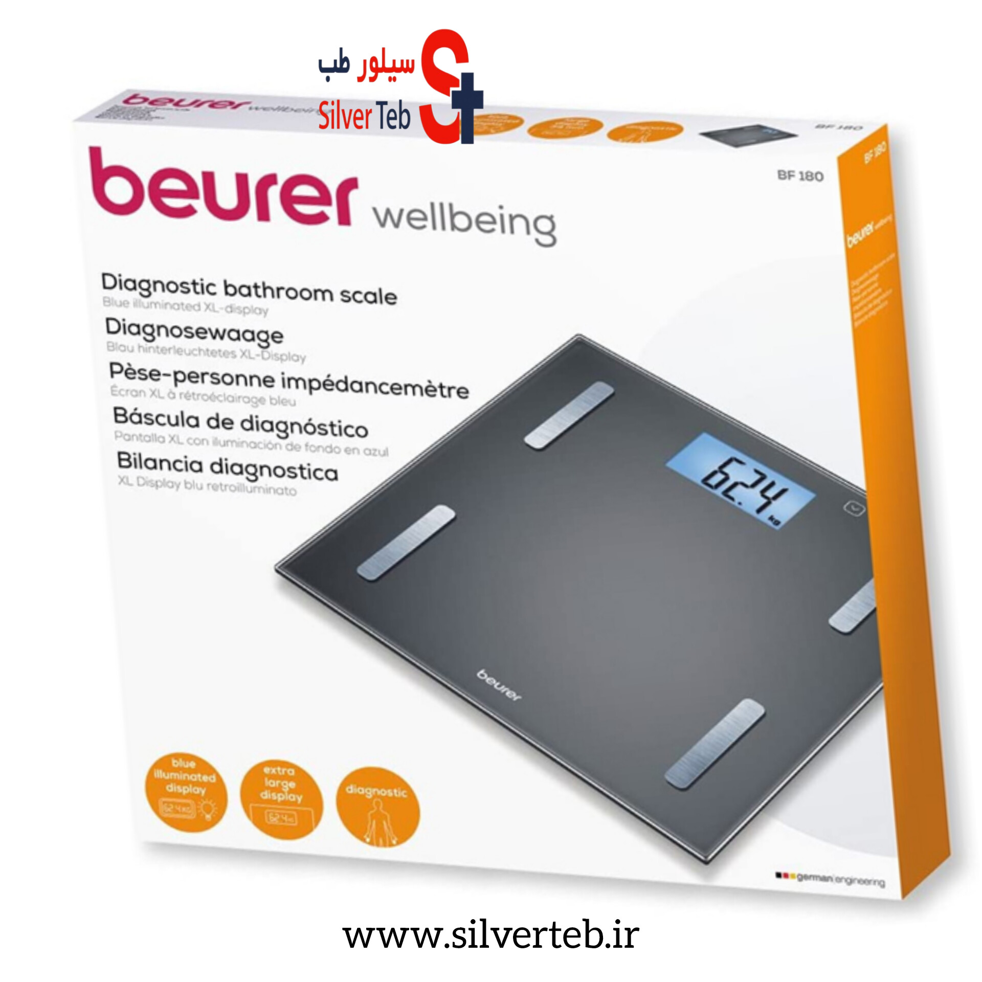 ترازو دیجیتال بیورر مدل BF180 از کمپانی آلمانی بیورر ترازویی دقیق است که با قابلیت اندازهگیری شاخصهای سلامتی BMI، درصد چربی، آب بدن، تراکم استخوان و ماهیچهی بدن و همچنین میزان سوخت و ساز بدن BMR میتواند برای کسانی که سعی بر کاهش وزن دارند، بسیار مفید و کاربردی باشد. این ترازو مجهز به دکمه های لمسی می باشد و همچنین خود ترازو برای 10 کاربر مجزا حافظه دارد. سیستم خاموشی خودکار یکی دیگر از قابلیتهای این مدل است. دستگاه وقتی فرد روی آن بایستد روشن میشود و پس از مدتی که بدون استفاده بماند، به صورت خودکار خاموش میشود. حداکثر وزن قابل تحمل این ترازو 180 کیلوگرم است که برای اکثر افراد با وزن نرمال کافی خواهد بود. دقت اندازهگیری این ترازو 100 گرم است. به این معنی که تغییرات وزن بیش از 100 گرم را نمایش میدهد.