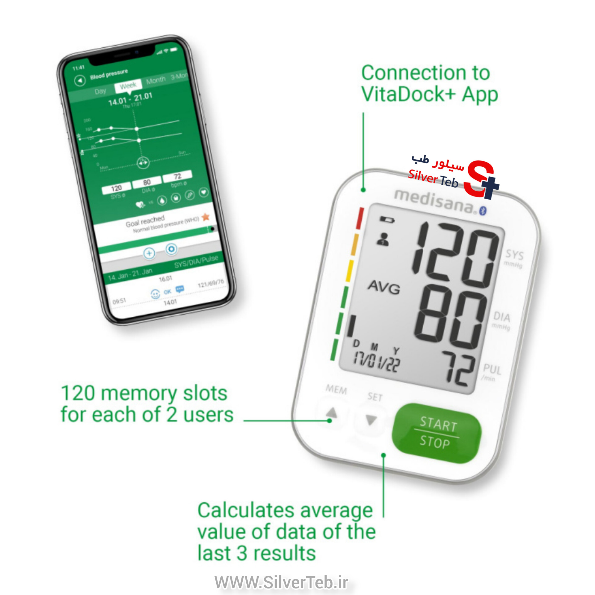 طبقه بندی مقادیر اندازه گیری شده با استفاده از مقیاس رنگ چراغ راهنمایی بر اساس سیستم ارزیابی WHO انتقال داده های Bluetooth® به برنامه VitaDock + برای iOS و Android و VitaDock Online دستگاه پزشکی تایید شده کاف مناسب برای دور بازو 22 – 42 سانتی متر
