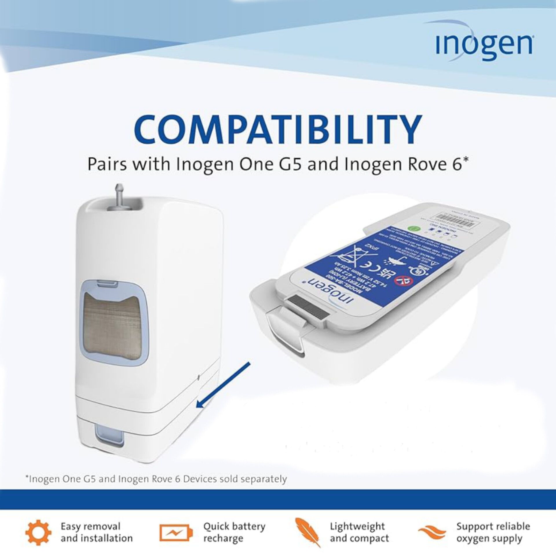 باتری اکسیژن ساز پرتابل اینوژن (G5_G6 (single شما را در مواقعی که به منبع تغذیه دسترسی ندارید، تغذیه می‌کند تا آزادی و تحرک کامل را برای شما فراهم کند. با یک باتری اضافی، می‌توانید هنگام سفر در سطح شهر یا خارج از شهر، یک باتری پشتیبان داشته باشید. با Inogen One خود برای مدت طولانی‌تری فعال بمانید! یک باتری اضافی تا ۶.۵ ساعت عمر باتری به شما می‌دهد.